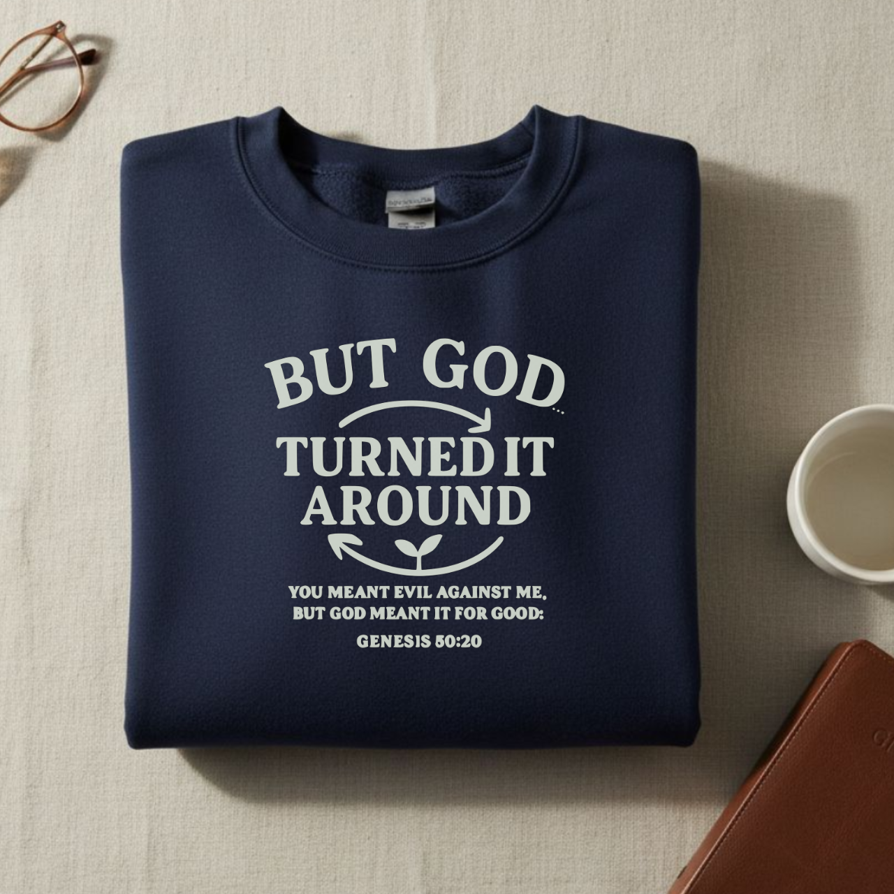 But God Turned It Around Sweatshirt • Genesis 50:20 Bible Verse Crewneck • Christian Women’s Faith Shirt • Gildan 18000 Pullover