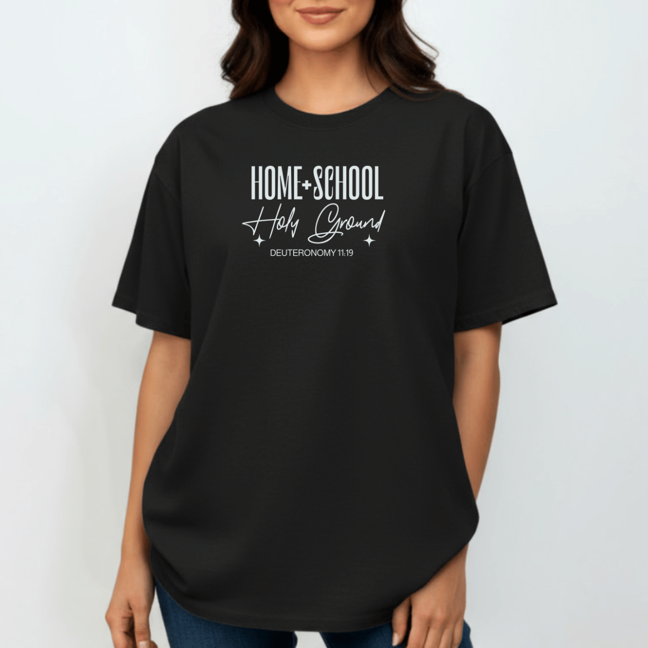 Where you study becomes holy ground when God is in it. This “Home + School • Holy Ground” tee draws inspiration from Deuteronomy 11:19, a reminder to keep God’s Word central in every season of learning—whether at home, on campus, or in between.