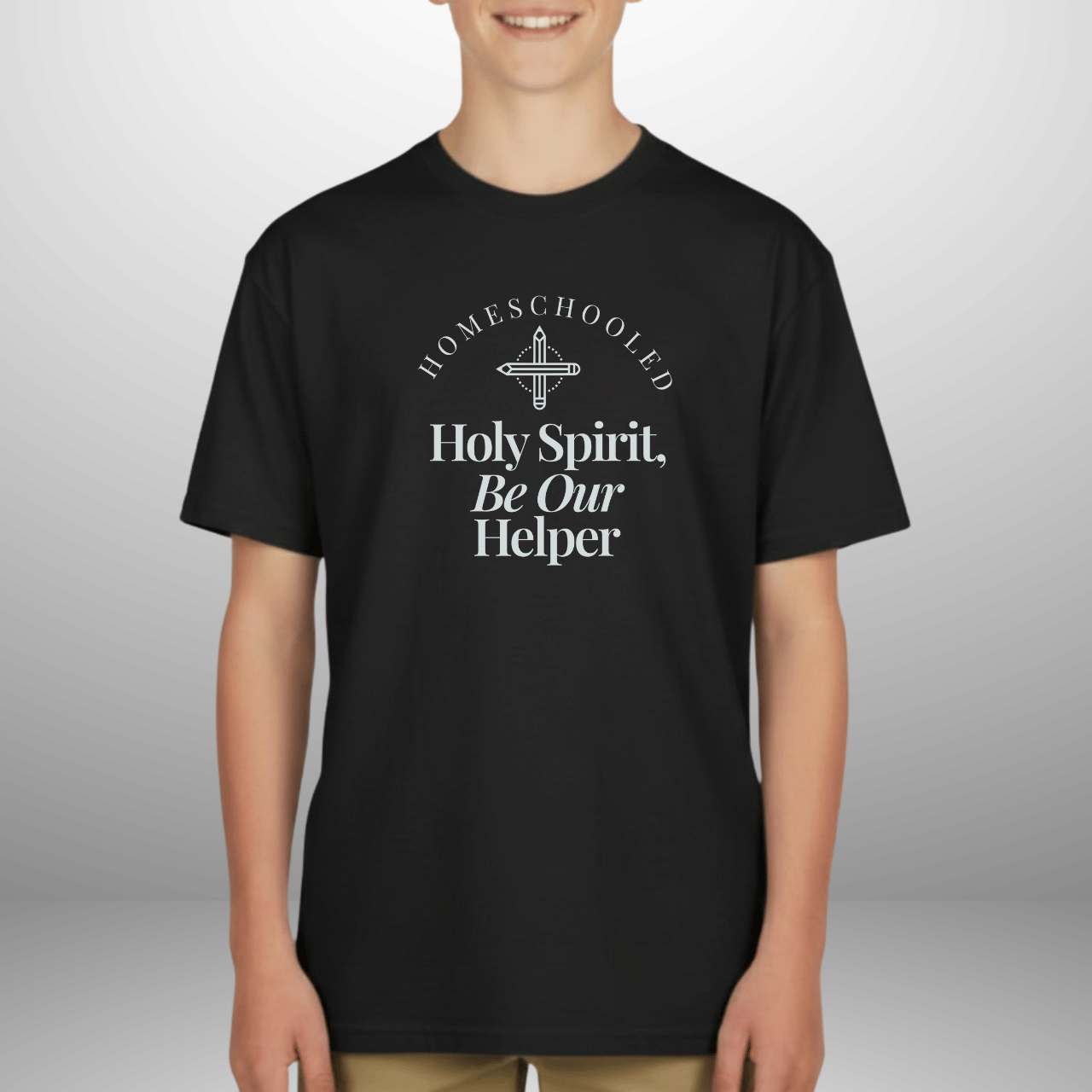 A sweet reminder that learning at home is holy work too. This “Holy Spirit, Be Our Helper” youth tee celebrates homeschool families who lean on God’s guidance each day. Inspired by John 14:26 — “The Holy Spirit… will teach you all things” — the design blends classic typography with a simple cross emblem to keep faith at the center of their learning.