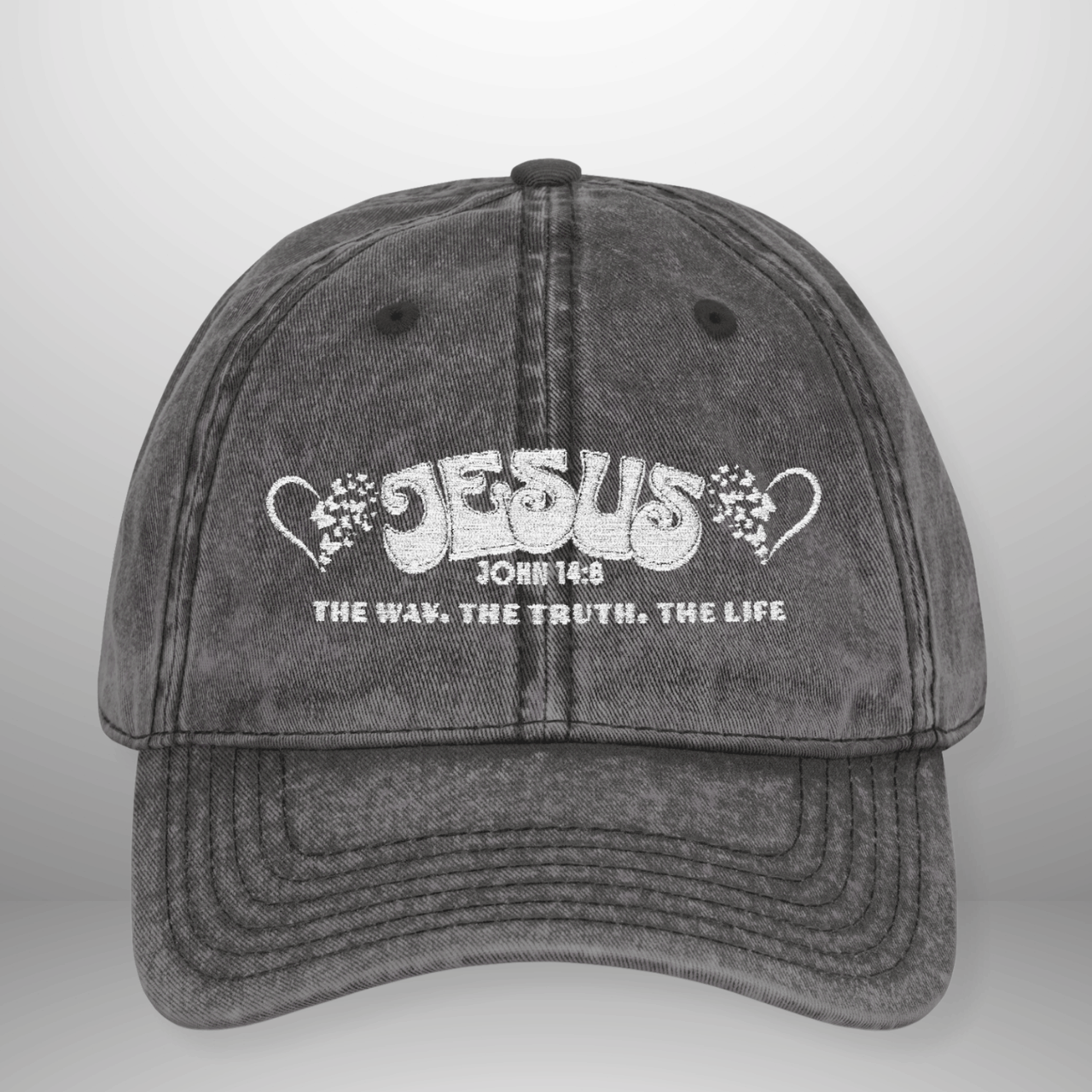 Inspired by John 14:6 — “Jesus, the Way, the Truth, the Life,” this vintage-style cap carries a worn-in charm and quiet confidence. Crafted from washed cotton twill with a naturally distressed finish, it delivers a relaxed, lived-in feel that settles effortlessly into everyday wear. The centered embroidery is stitched in white thread, adding subtle depth and meaning while keeping the look timeless and understated. A low-profile, six-panel silhouette sits comfortably on the head, finished with an antique brass buckle for an easy, adjustable fit. A thoughtfully aged piece—perfect for slow mornings, casual outings, and wearing purpose with ease.