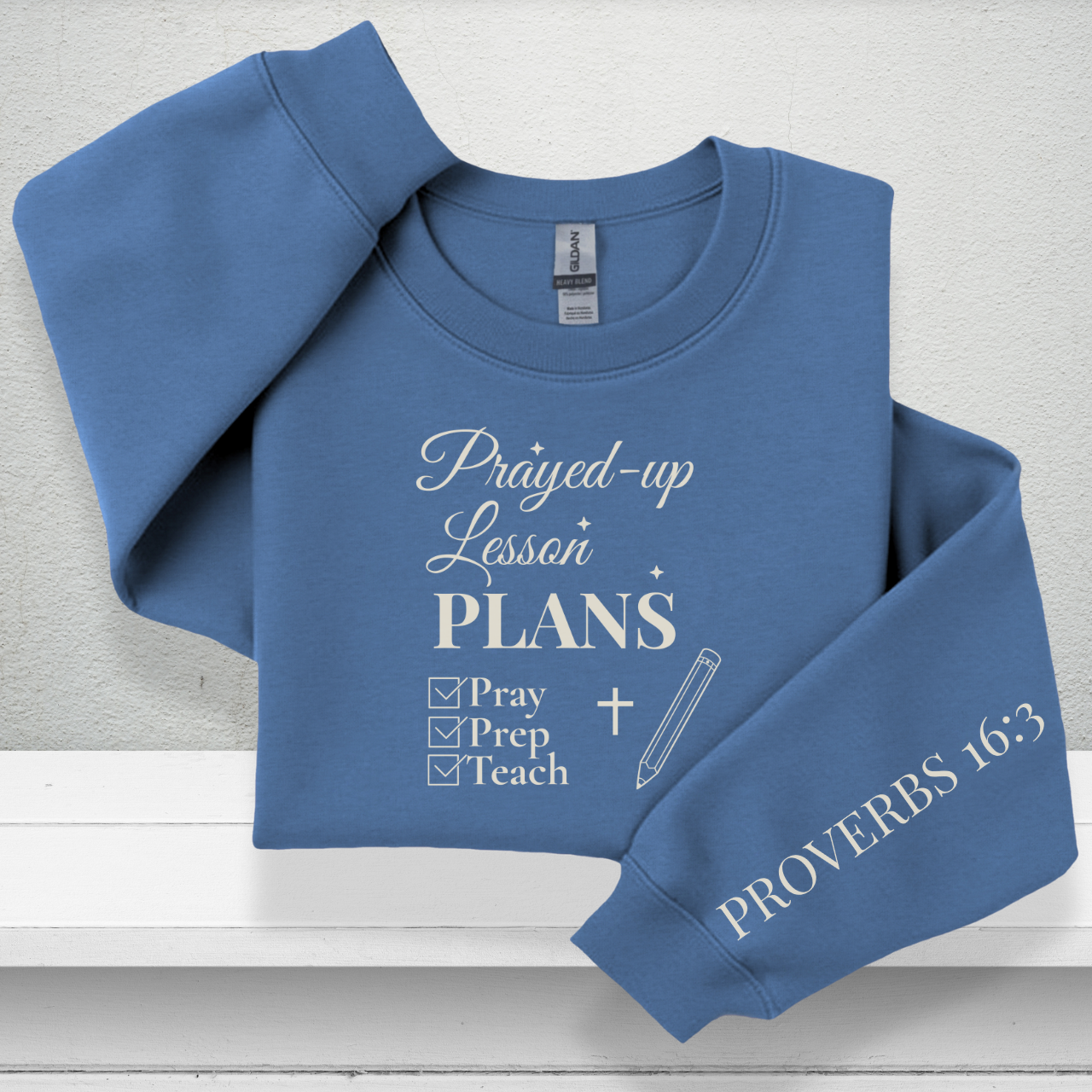 Prayed-Up Lesson Plans w/Bible Sleeve Verse (Proverbs 16:3) Christian Teacher Sweatshirt • Gildan 18000 Unisex Fleece • Back to School