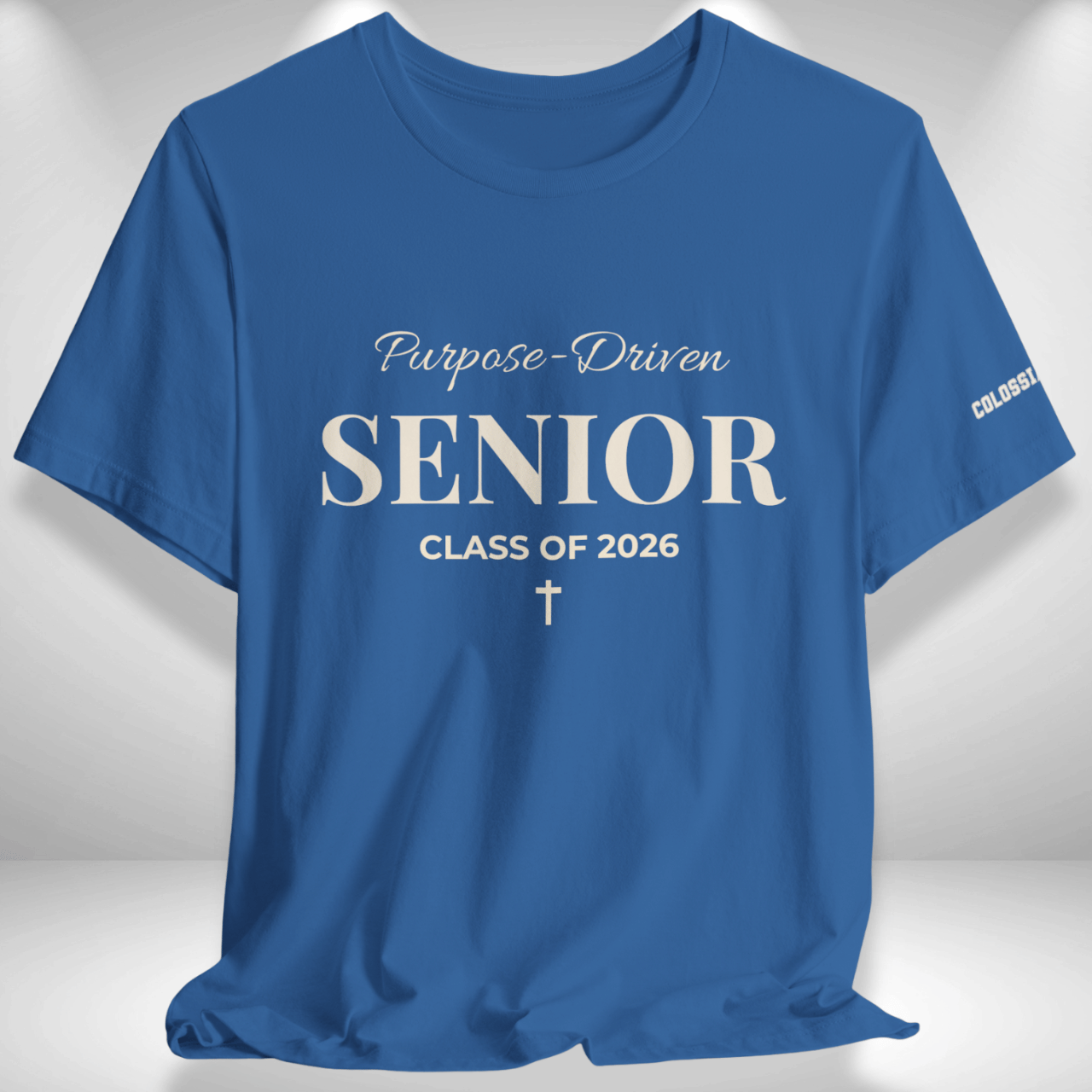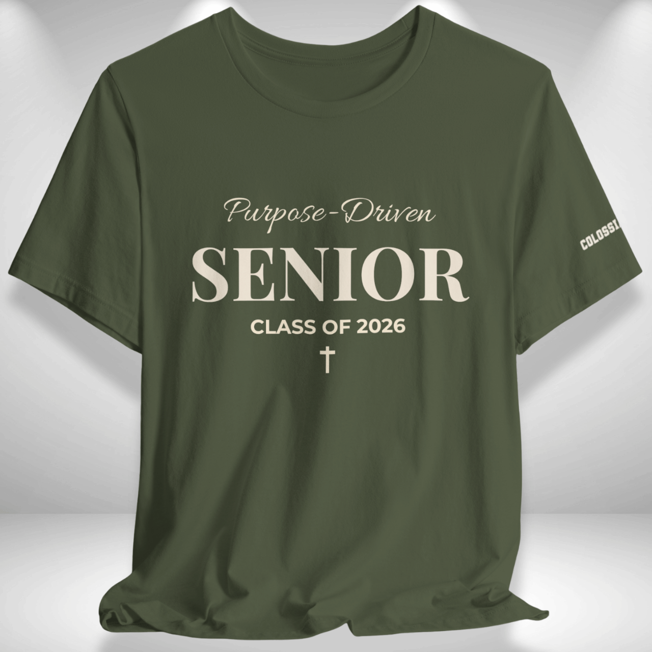 Purpose-Driven Senior Class of 2026 (Colossians 3:23 Bible Verse on Sleeve) Christian Tee —White Print — Bella+Canvas 3001